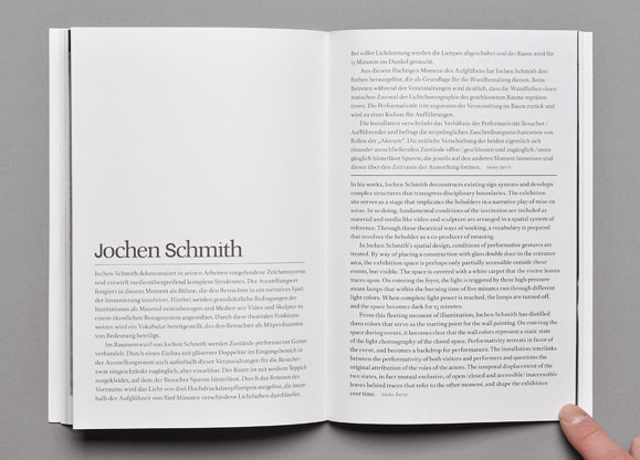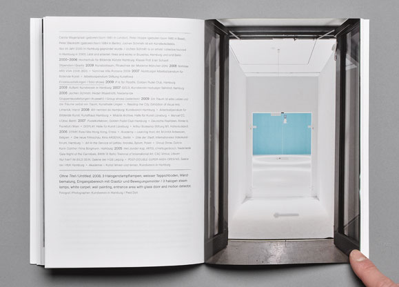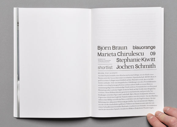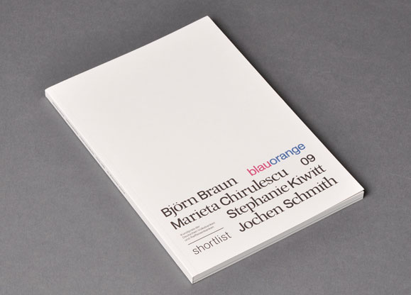 Blauorange is an art prize awarded by Germany’s Volksbank and Raffeisenbank to young artists living in Germany that is curated by Veit Loers and Bettina Klein. The publication introduces the work of short-listed artists Björn Braun, Marieta Chirulescu, Stephanie Kiwitt, and Jochen Schmith.