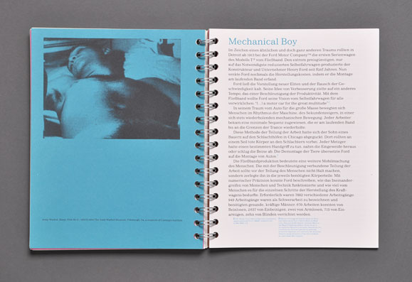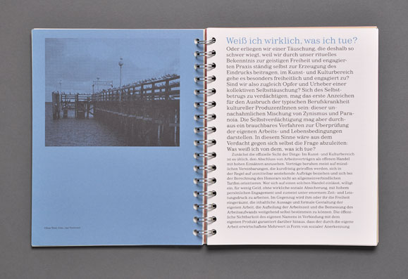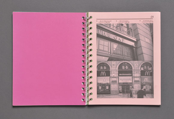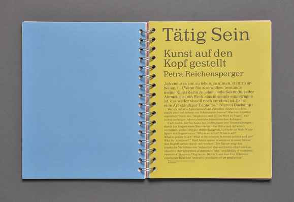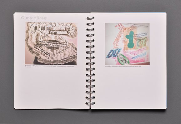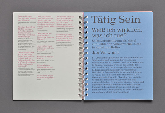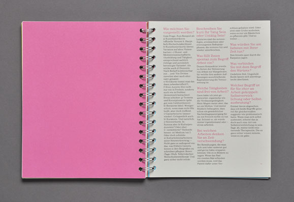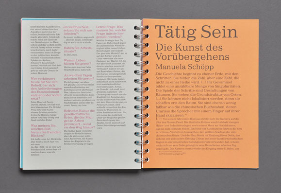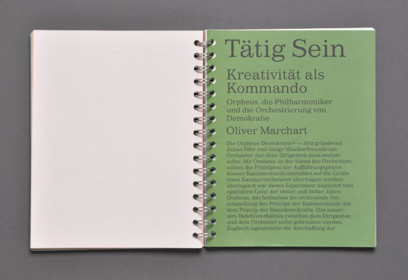 The concept was based both on the highlighting each contribution’s individuality and making the overall design of a spiral block look like a manuscript.This manuscript style is reflected in the dense typography, the different full color pages, and the selected recycled paper. An non-linear page sequence was created by omitting page numbers and by the use of a spiral binding that allows each page to be the first page.