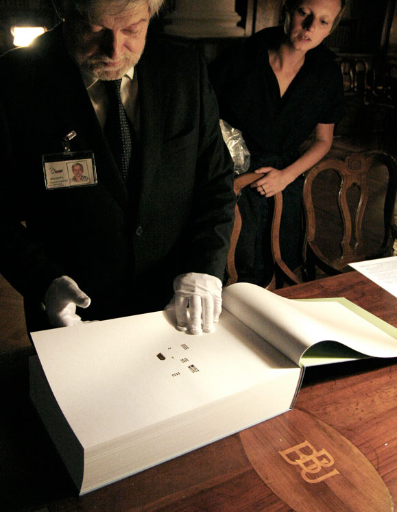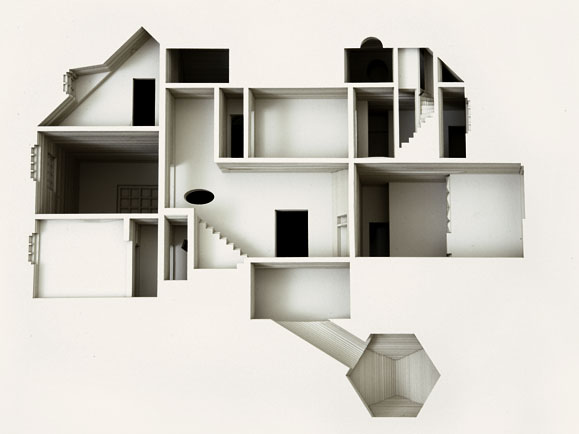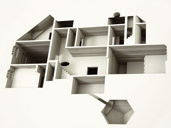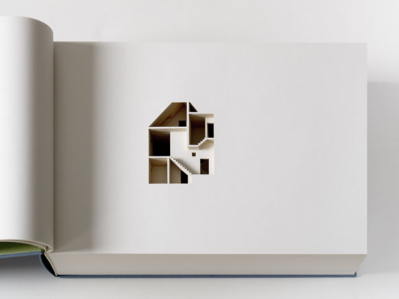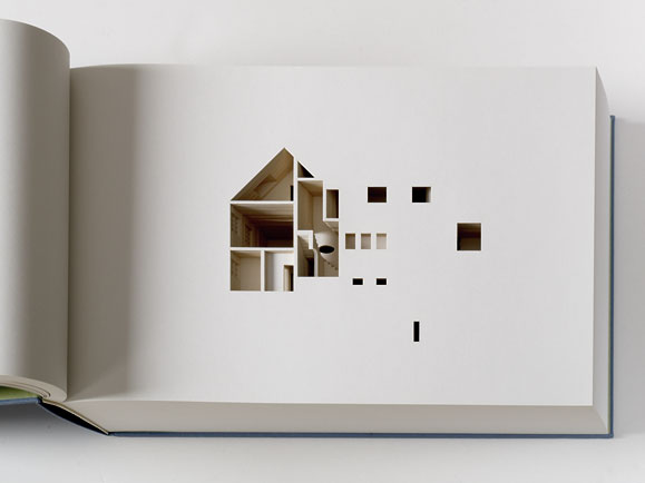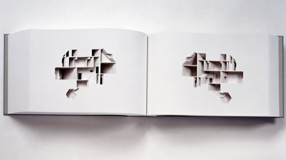 Commissioned by the Library Council of the Museum of Modern Art in New York, Your House consists of a laser-cut negative of Olafur Eliasson’s house in Copenhagen at a scale of 85:1. The book is based on a computer-generated model of the house sliced vertically into 454 even parts. Each of the corresponding 454 hand-bound, individually-cut pages corresponds to 2.2 cm of the actual house.